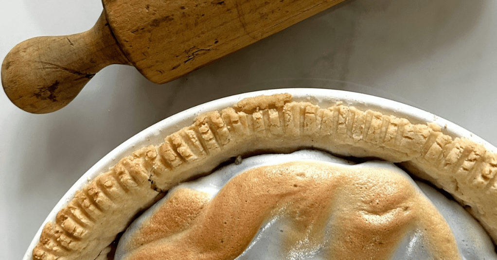 PASTRY. – Three large tablespoons of flour sifted with half a teaspoon of KARN’S BAKING POWDER, rubbing into it a large tablespoon of cold butter, or part butter and part lard, and a pinch of salt, mixed with cold water enough to form a smooth, stiff paste; roll out thin. This is enough for an under crust for custard or pumpkin pies.
