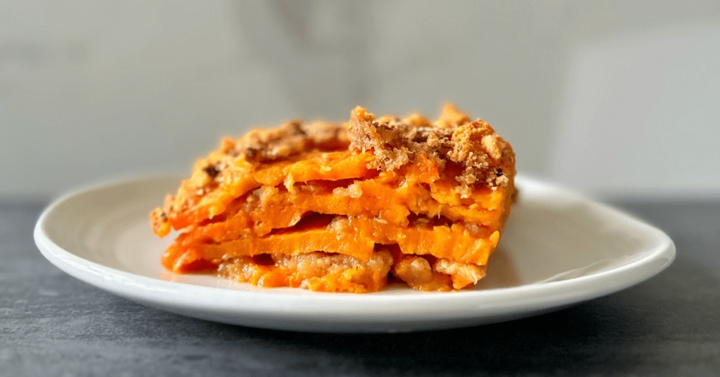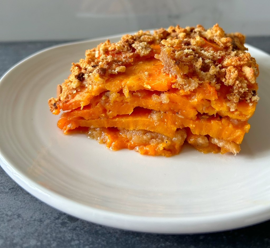 A note from Patricia: Adding a French phrase like ‘au gratin’ to the end of any food automatically makes it feel fancier and perhaps more complicated, but this recipe couldn’t be any simpler or easier. The brown sugar complemented the natural sweetness of the sweet potatoes, and I adored the crispy, buttery top, and smooth layers beneath. I used some stale gluten-free bread pulsed in the food processor to make my breadcrumbs, and found this dish to be nourishing and satisfying, and too good to save for special occasions.