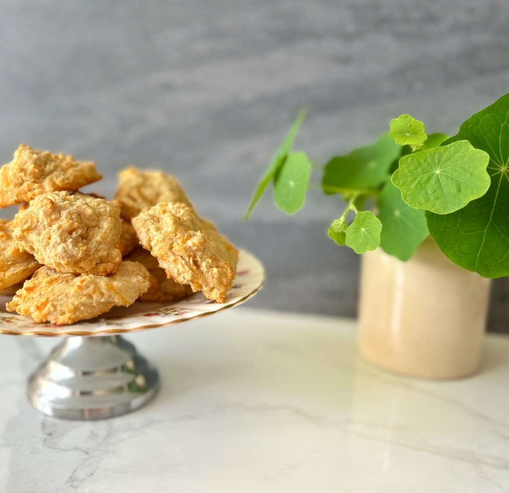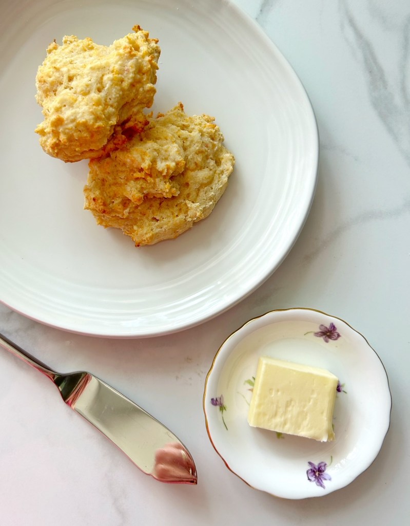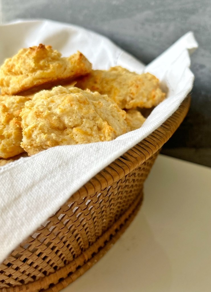A note from Patricia: I have always been a big fan of tea biscuits, especially the cheese variety, and so I was game to try these. Tea biscuits are quick to make, I’ve typically got all of the ingredients on hand, and there’s nothing better than a warm tea biscuit straight from the oven topped with butter or jam. I used 1:1 gluten free flour for this, and ate far too many in one sitting. However, you could enjoy these with a cup of tea, a bowl of soup or chili, or with a quiche. YUM!