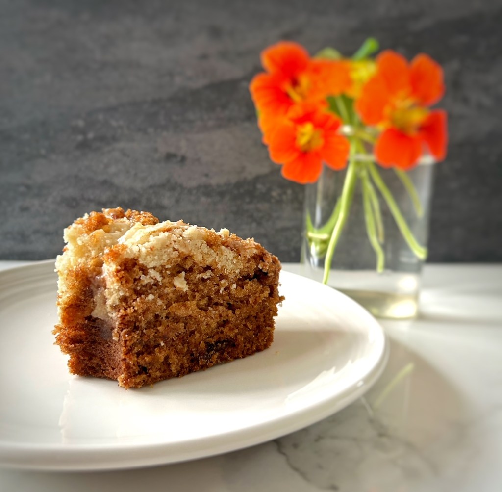 This is delicious served warm; the cake is surprisingly light, and the flavour delicately spicy. The crusty crumb topping provides a pleasing contrast in textures.
