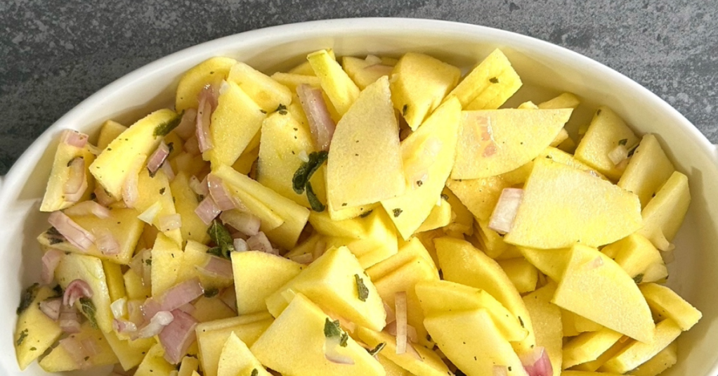 How to Buy. – Hard green russets are the most suited for this purpose. How to Prepare. – Pare and slice the apples as thin as possible, and treat sufficient shallots to flavour in the same way; put them together in a dish, with a few very tender sage leaves well bruised, pepper with cayenne, and moisten them thoroughly with oil and lemon juice.