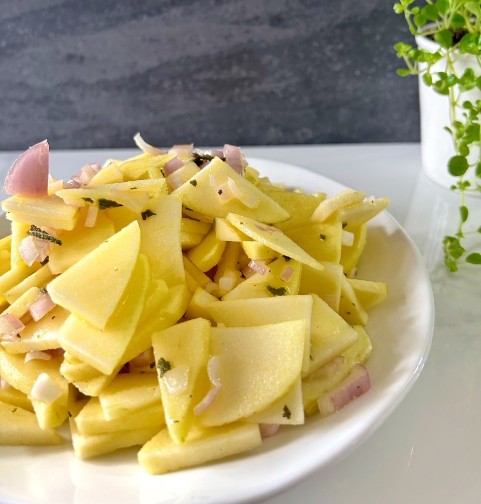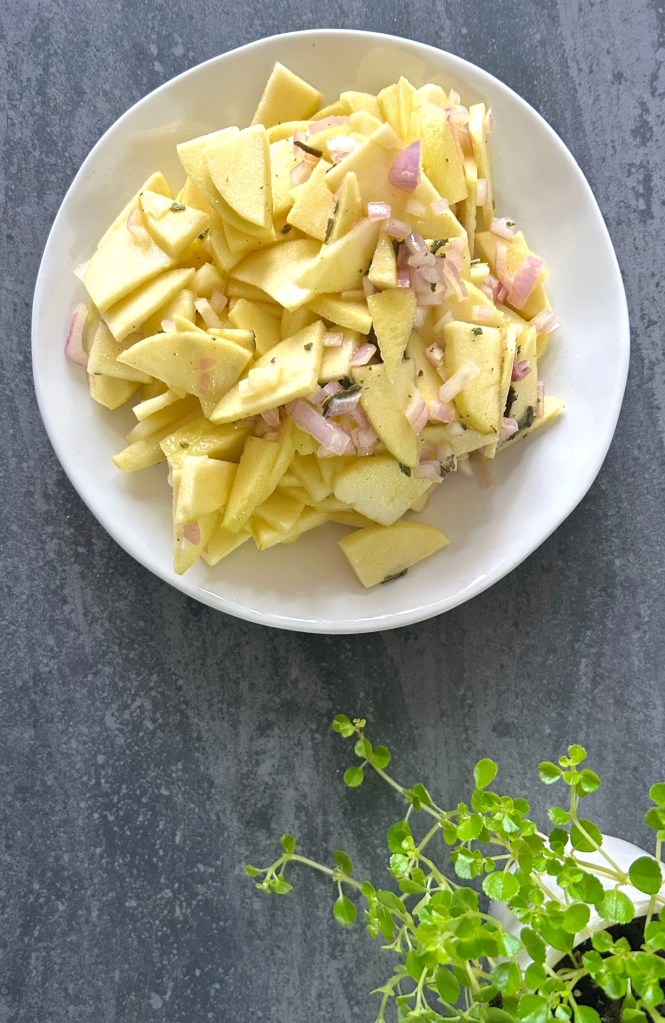 The ingredients for Russet Apple Salad are available in the Autumn; the distinctive blend of flavours, and the crisp texture of the Russets make this salad a fresh and tangy accompaniment for cold pork or poultry. It’s lovely with Baked Pork Tenderloin.