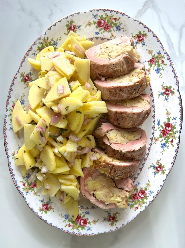 A note from Patricia: I had never had a Russet apple before, and became apprehensive at the grocery store when I found them. It’s not a pretty apple to look at, and the skin is rough and thick and greenish-brown, but I was eager to try this Russet Apple Salad so that I could pair it with the Baked Pork Tenderloin recipe. I was happy to discover that it’s a pretty special type of apple once peeled – tart and sweet and tangy. And apparently it’s one of the oldest apple varieties in Ontario, which is kind of cool. The salad was delightfully zesty and refreshing – and was perfect with the pork. I’ll be making it again and again!