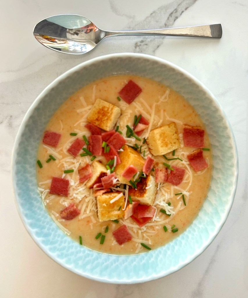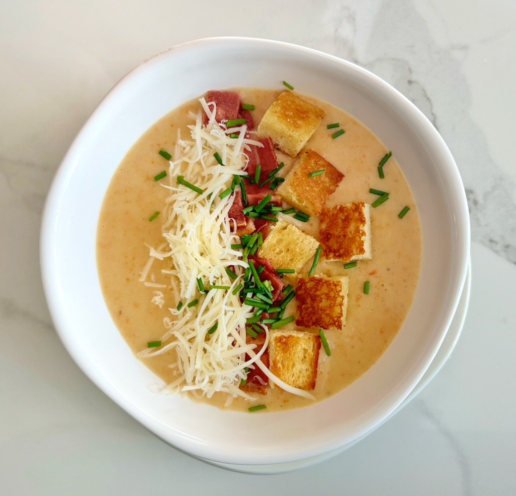 - optional toppings: cheese, fried bread, chives, fresh parsley, sour cream, bits of bacon or pancetta.