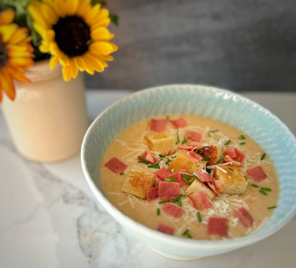 A note from Patricia: I had some spuds that looked like they needed cooking, so this soup seemed like a nice and easy one to try on a chilly fall day, and a good way to make use of some vegetables that had been kicking around. This soup couldn’t have been simpler, and was definitely comforting, cozy and flavourful. I used plain oat milk (because that’s all I had on hand), made some fried bread, cooked up and chopped some turkey bacon, cut up some chives from my garden, and grated up some cheddar cheese, and voila! It was a beautiful, delicious and filling soup that hit the spot. While the soup is tasty on it’s own, it definitely took it up a few notches by adding all sorts of toppings, and I’m looking forward to the leftovers.