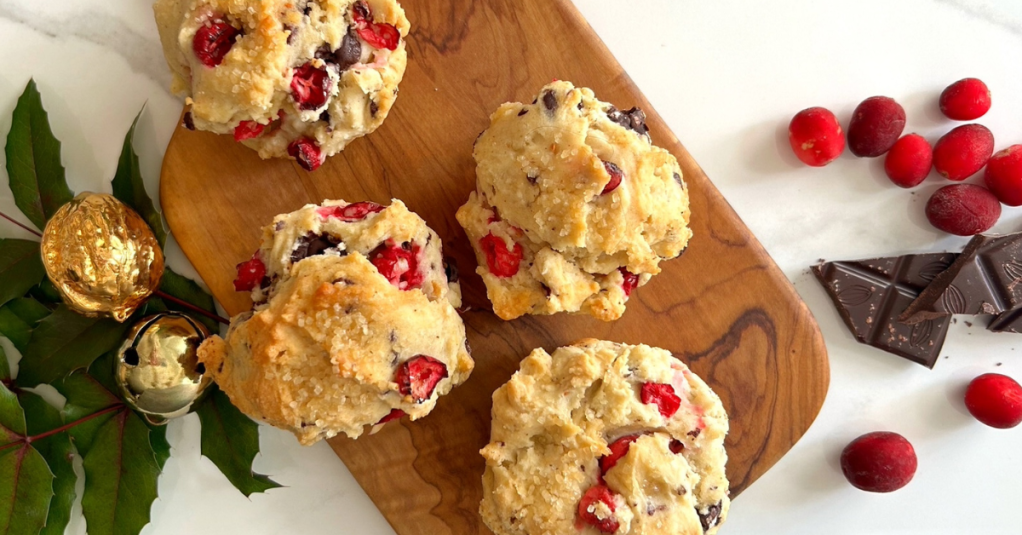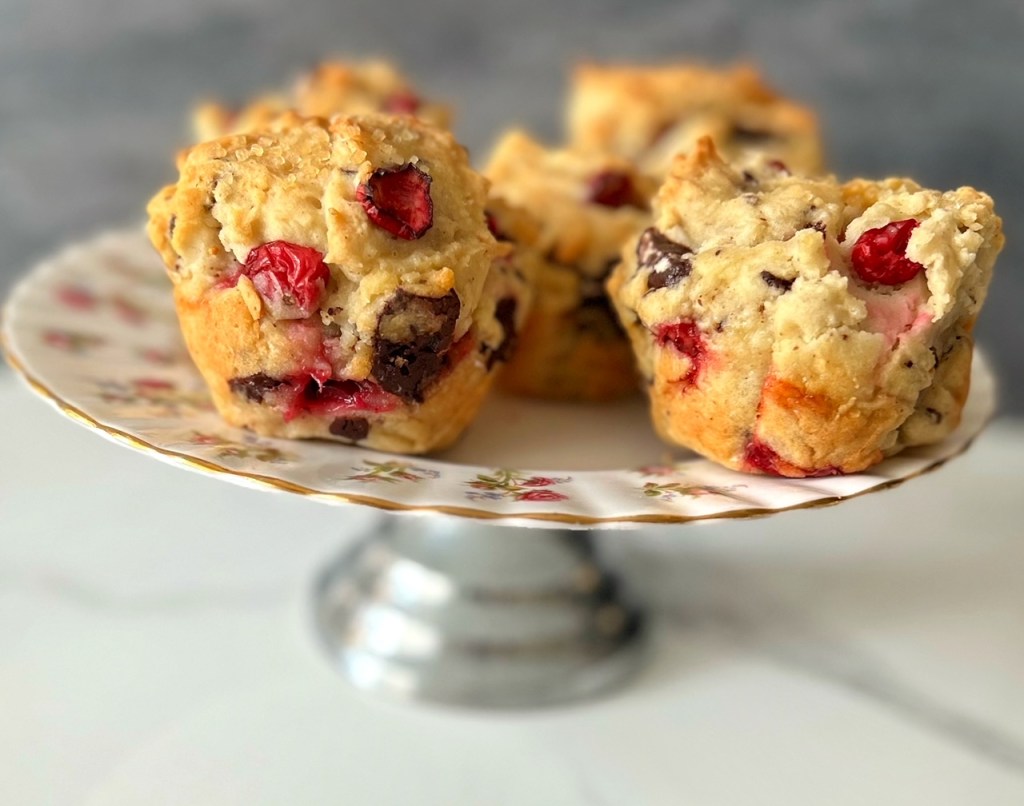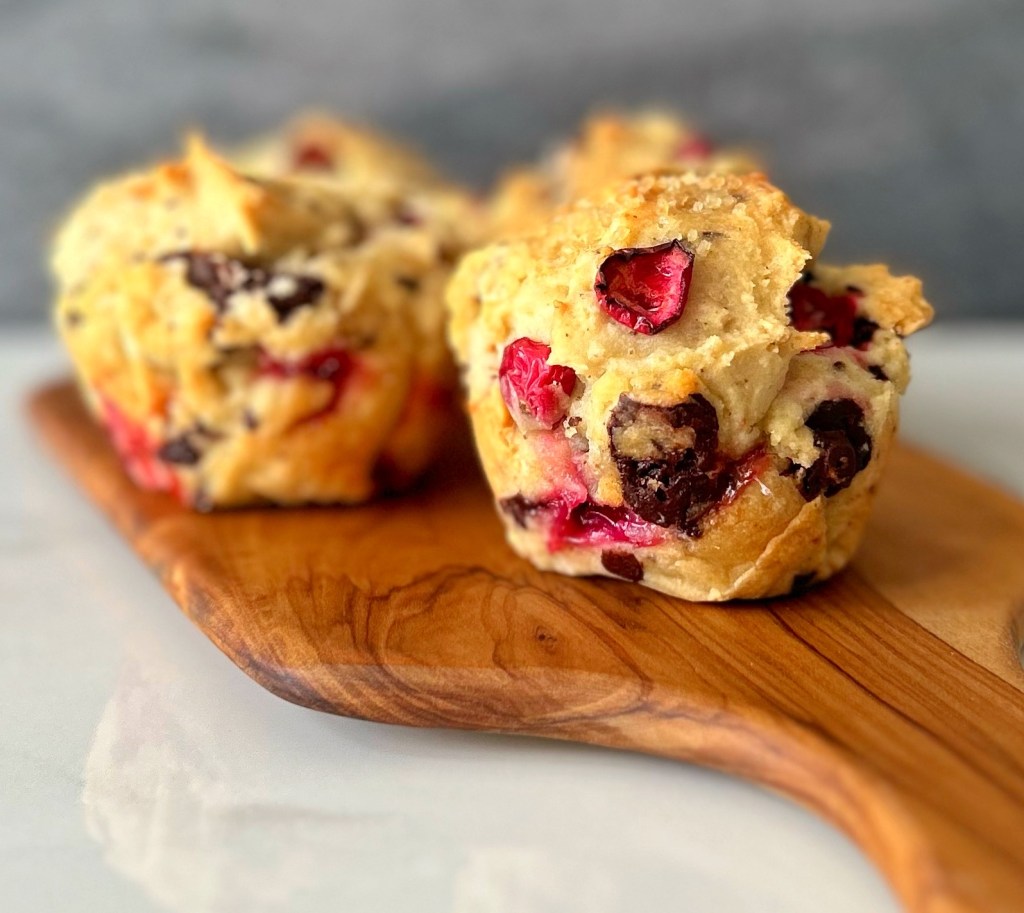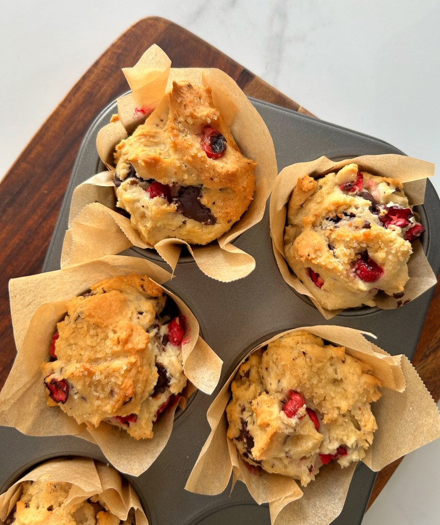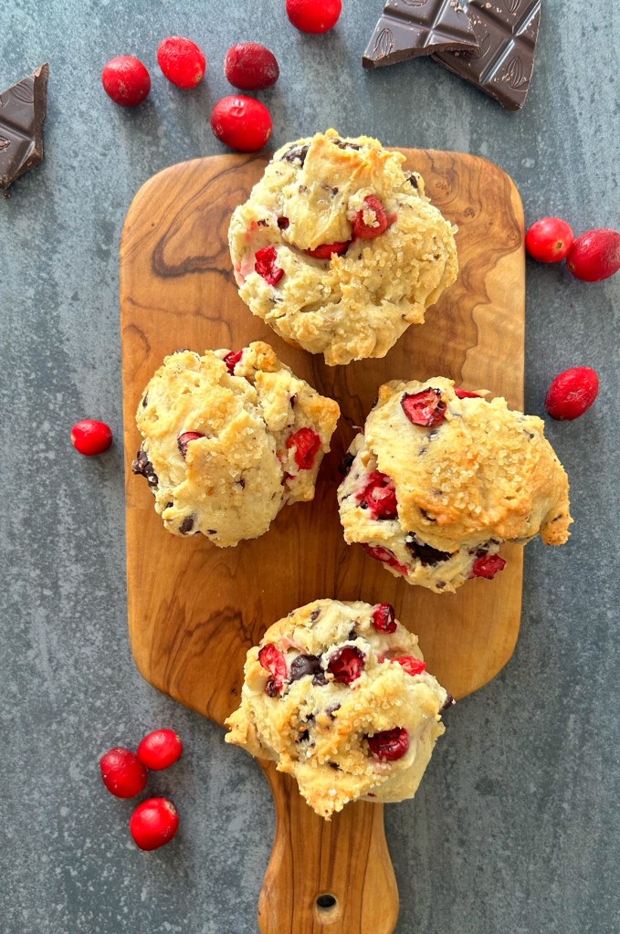 A note from Patricia: The original recipe that my aunt had tested indicated to use elderberries, but since I wasn’t quite sure where to procure elderberries this time of year, I decided to go the festive route and use frozen cranberries. Aaaaand I thought it would make these extra special if I added chunks of dark chocolate as I love that particular combination. I wasn’t quite sure what these were supposed to look like….. they get baked in muffin tins, but the batter was quite thick, and not exactly pourable like a muffin batter would be, so I piled the batter into the tin liners and hoped for the best. These were more dense than a muffin, (maybe more like a pound cake), and I absolutely loved them. Chocolate and cranberries are fantastic together, and topped with butter, they were a real treat. I substituted 1:1 gluten-free flour with good success, and will definitely be making these again – maybe as a Christmas morning treat.
