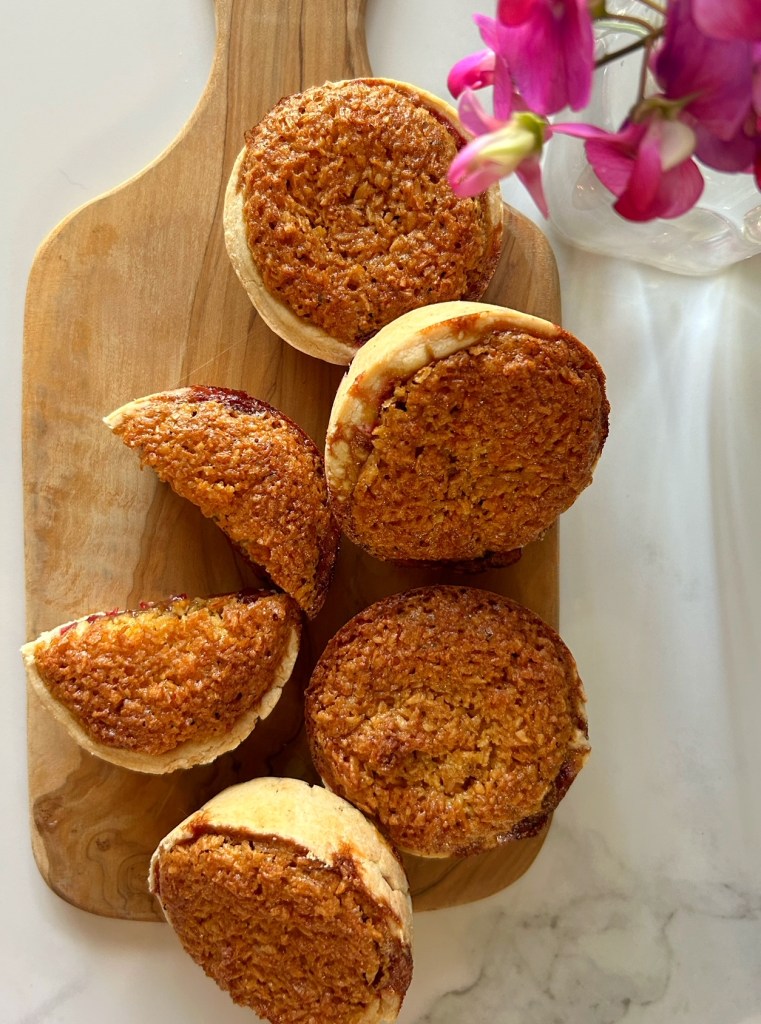 A note from Patricia: I’m continuing to fill my face with raspberries, so this recipe seemed right up my alley to try next. I used the ‘Rich Short Crust‘ and made it gluten-free with 1:1 gluten-free flour, and used my muffin tins so that the tarts would be a bit larger. I didn’t have raspberry jam, so I whipped some up on the stovetop using frozen raspberries, lemon juice and sugar (thank you, internet). The raspberries and coconut and pastry were a glorious combination – these were sweet and tart and delicious.