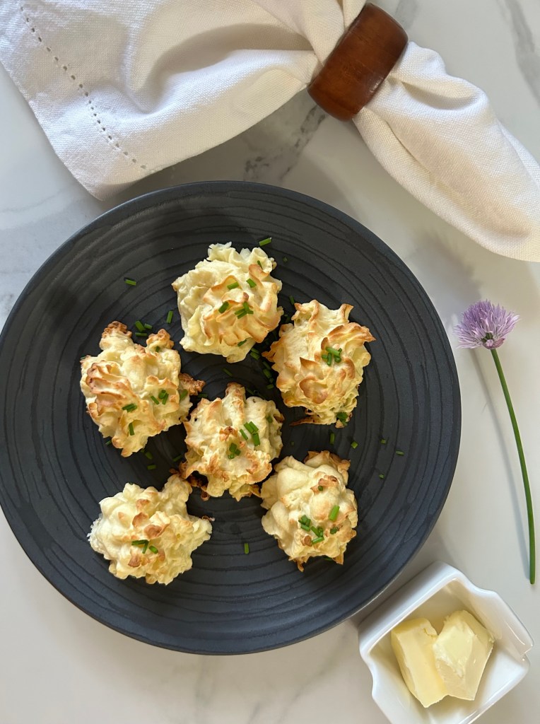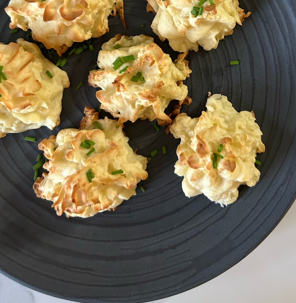 Half a dozen potatoes, steamed till cooked, mashed through a colander, mix with two eggs and a little salt; grease a pan and drop in small cakes. Bake.