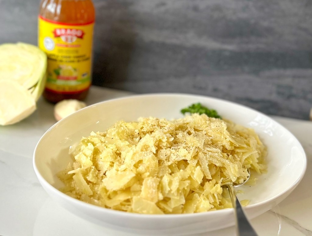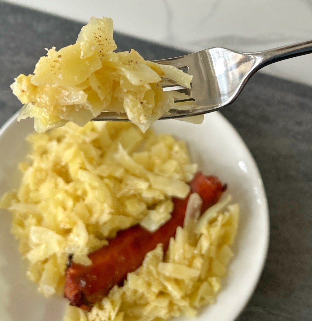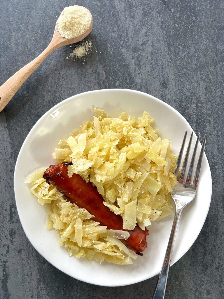A note from Patricia: Cabbage and Parmesan? Sounded interesting to me! It wasn’t a combination that I had ever thought of trying, but I’m glad that I made this, and I know I’ll make it again. It must be the German in me that is always drawn to cabbage, and this was a new and different way of eating this underrated vegetable. It was buttery and cheesy and tangy, and I enjoyed every bite. I had a chicken sausage in the freezer, and it went really nicely with the cabbage. YUM!