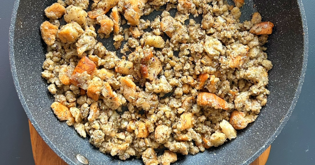 Remove the pan from the heat, and use the dressing to stuff poultry or “Mock Duck“.