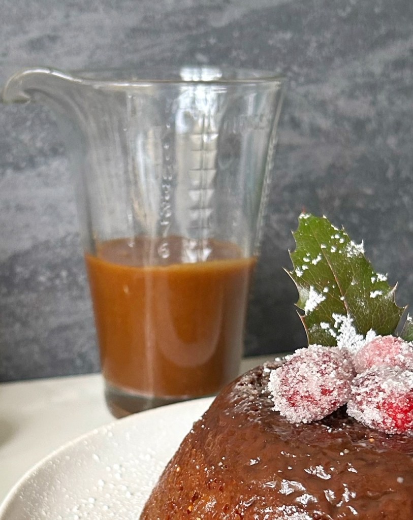 A note from Patricia: This recipe intrigued me because I’ve never had a slice of “Figgy Pudding” before, so out came my pudding bowl once again. However, before I began cooking, I did a little research online to learn more about both Fig Puddings and “Figgy Duffs” as my aunt had mentioned above. Fig Puddings were made as far back as the 1600’s in Britain, and for the wealthy the pudding contained real figs. Poorer people prepared the same recipe with raisins, as figs were too expensive, and over time began referring to raisins as “figgies”. A “Figgy Duff” is a Newfoundland tradition, and is a steamed bread pudding containing raisins (no actual figs are involved). I wonder if perhaps the original recipe from long ago that is noted above truly called for figs or if perhaps using raisins is assumed? Regardless, I used dried figs, and was glad that I did. I chopped them in my food processor, and substituted gluten-free breadcrumbs for the white breadcrumbs required. I covered my pudding bowl in a square of parchment and a square of tin foil, and then tied a string around the lip of the bowl, and then steamed it in my crock pot (that had an inch or so of water in the bottom) for about 4.5 hours on low. I read somewhere that it’s pretty hard to overcook a steamed pudding, so I wasn’t worried about it being in there so long. I whipped up a batch of “Brandy Sauce for Plum Pudding” as it seemed like a good choice (traditional Fig Puddings often contain brandy), and oh boy! Delicious. The pudding was moist and sweet and had the tiny crunch of the fig seeds (ahhhh memories of eating Fig Newtons!), and the sauce was sinfully sweet and buttery. It was really lovely, and felt festive and cozy and comforting.