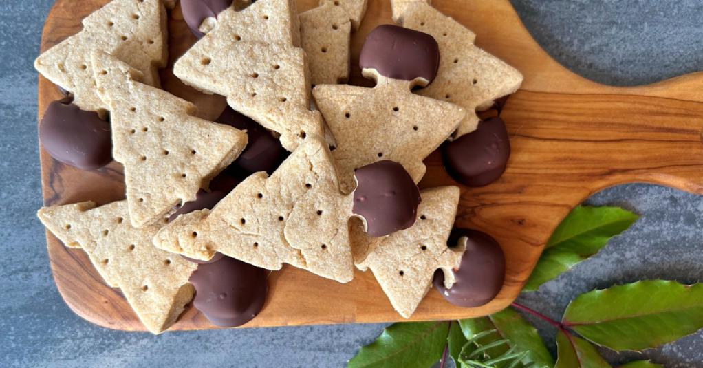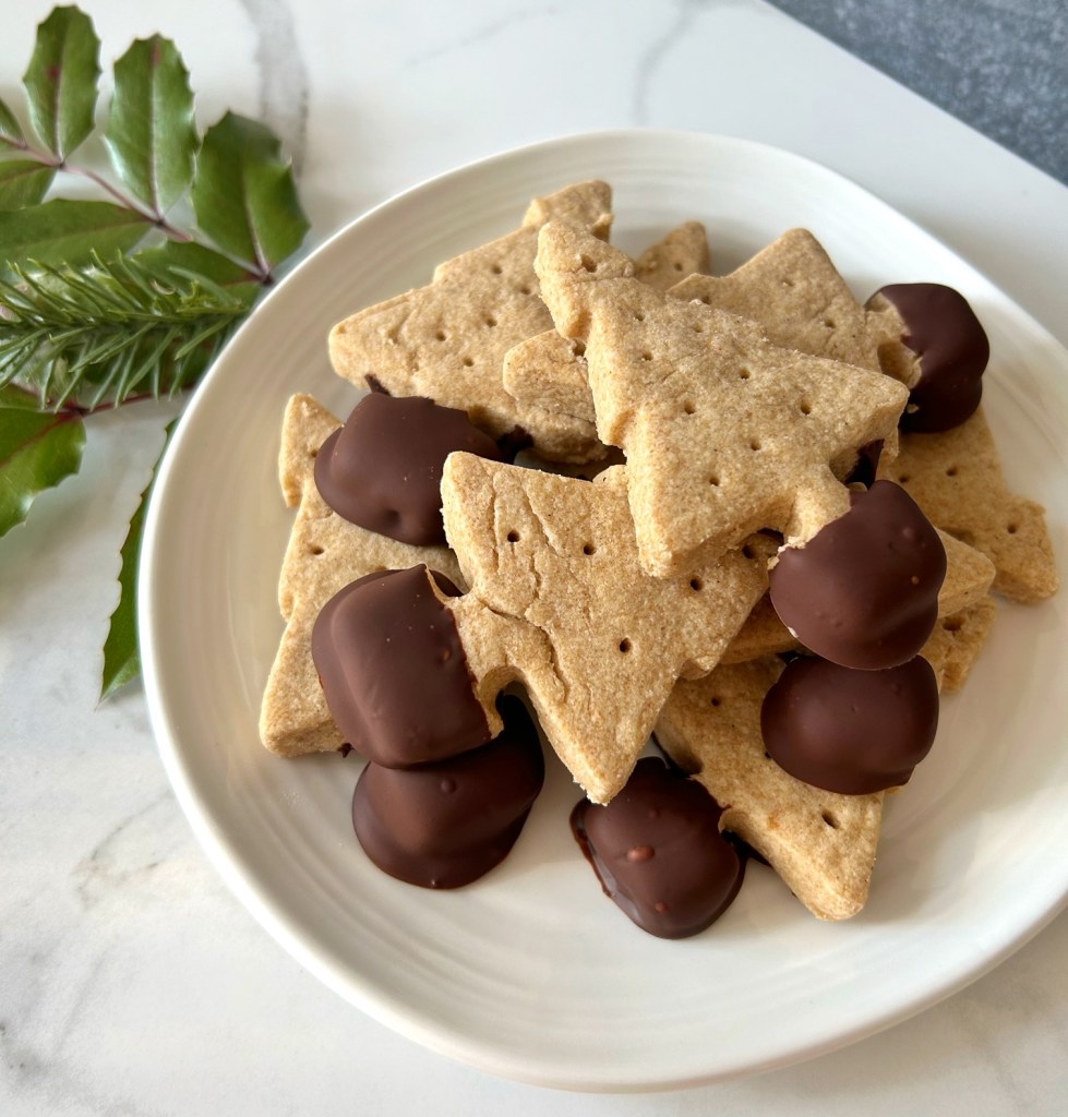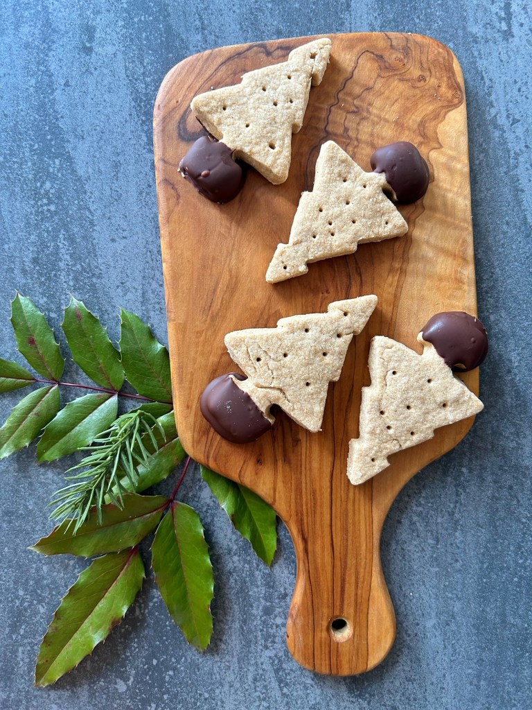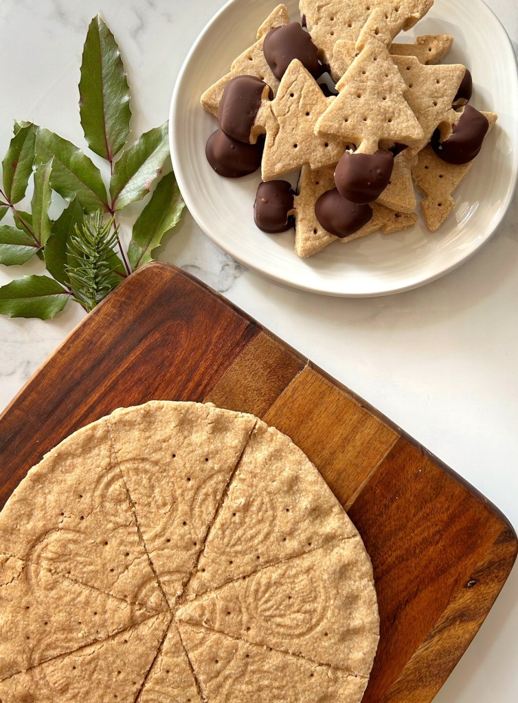 A note from Patricia: I, too, remember Gracie’s shortbread. Many a Christmas, our family would receive one of these rounds of shortbread that had been tied with a bow, and was lovingly placed in a square box. It was always delicious, and we would enjoy pieces of it after Christmas dinner along with dessert. This was my first attempt at shortbread, so I quartered the recipe just in case – with such a large quantity, and my lack of skill, I was worried that I’d make a mess of things and then it would be a waste of a large quantity of ingredients. I used 1:1 gluten-free baking flour in place of the all-purpose flour, and used a scotch thistle cookie stamp that I found among my aunt’s antique cookie cutters to decorate the top of the shortbread along with my thumb prints. I made one round of shortbread, and then cut out some trees with the remaining dough and dipped the bottoms in melted dark chocolate. As for the flavour? Let me tell you…..this shortbread was just as good as I remembered. What a lovely and heart-warming (not to mention easy!) holiday tradition, to make pretty rounds of shortbread as gifts.