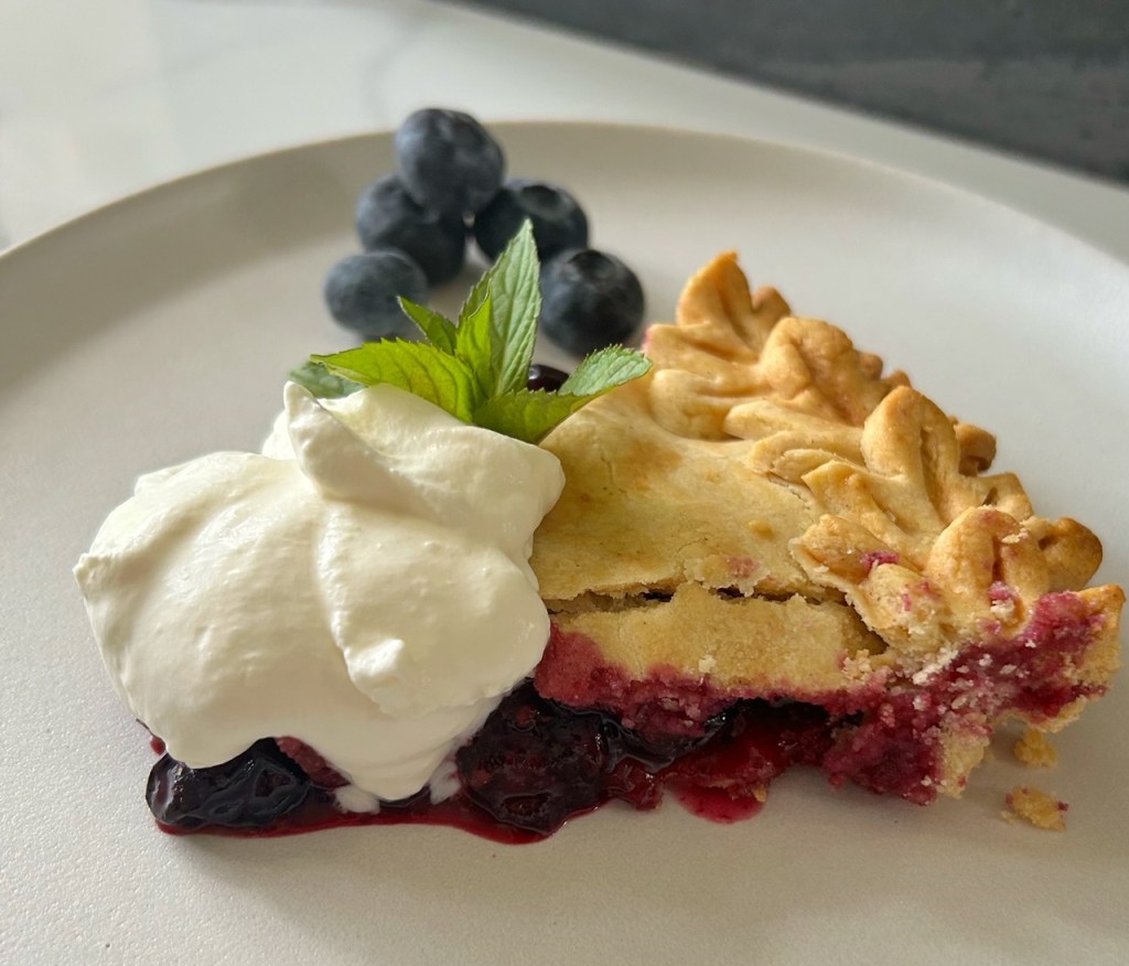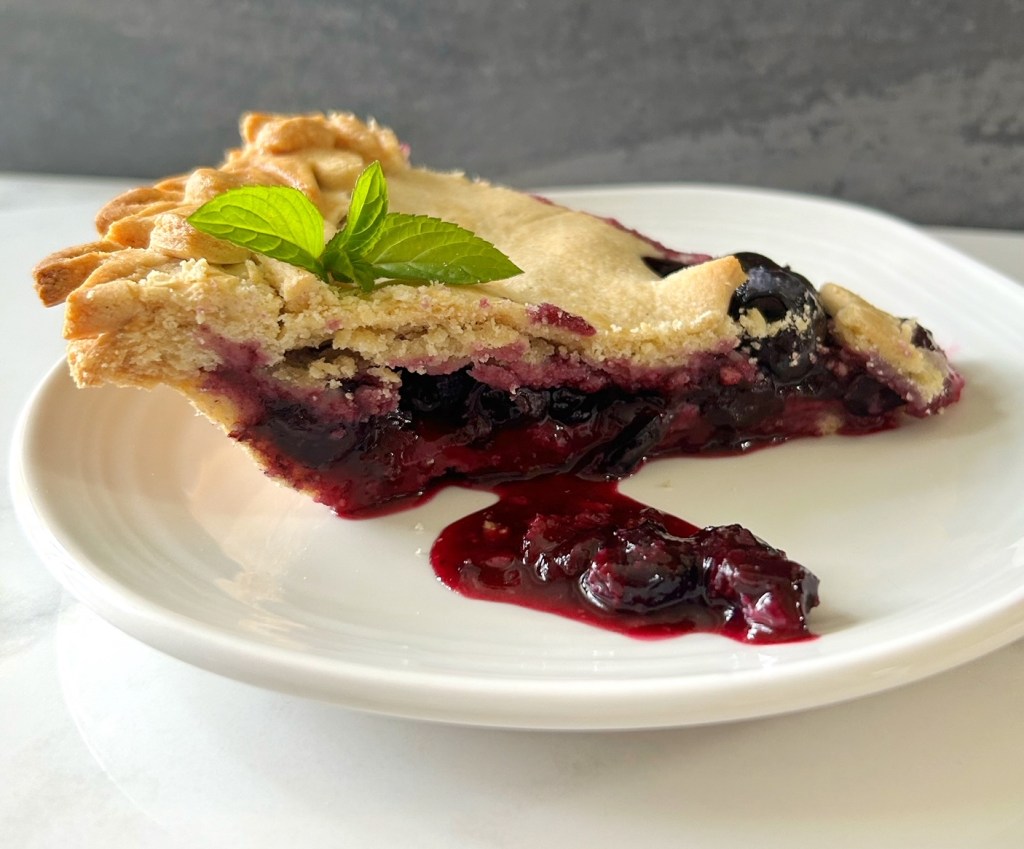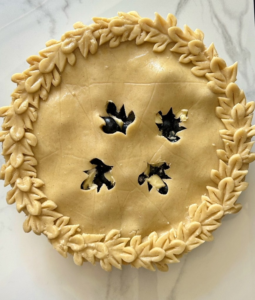 A note from Patricia: This is only the second pie that I’ve made in my life (the first being “Raspberries in Ambush“), and so it was a fun learning experience for me getting that top crust on. I’m thankful no one was watching me and judging, and to be honest it took a few tries and it’s still off centre. I made the crust with 1:1 gluten-free baking flour, and it worked well – I did have to add a bit more than the 1-2 tablespoons of cold water as the pastry still seemed dry and didn’t feel like it was binding. My creative juices were flowing today, so I decided to make my life more difficult with a leaf-shaped cookie cutter detail around the edges. I used a toothpick to add the grooves in the leaves, and I think it’s pretty cute the way it turned out. The taste? Sweet and delightful, bursting with blueberry and lemon flavours – my favourite combination. Be sure to use the “Rich Short Crust” pastry…. it’s divine!